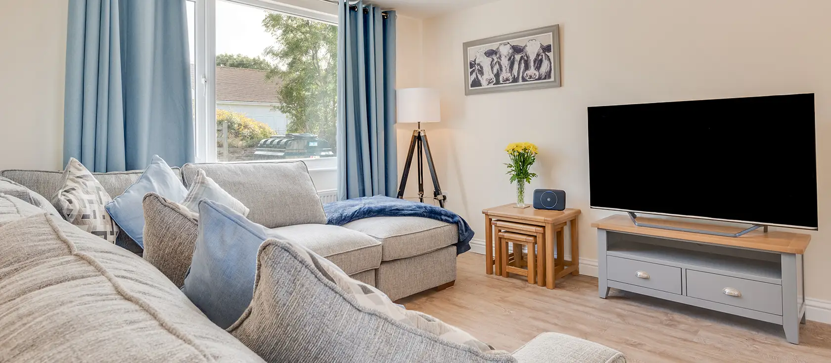 Step outside to discover a raised patio with picnic bench, ideal for morning coffee or evening drinks, whilst a few steps down lead to an expansive lawn where children can play freely and adults can unwind. The property features three comfortable bedrooms: a king-size with Smart TV, a double, and a single, along with two modern bathrooms, both equipped with shower cubicles ensuring comfort for all guests.