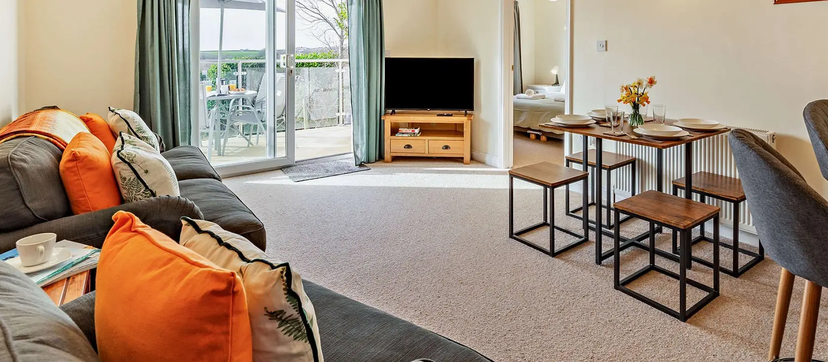 Little Trelana, Kilkhampton is a charming single-storey cottage perfectly suited for couples and small families seeking a peaceful coastal escape. The contemporary kitchen boasts elegant units with an electric oven and hob, dishwasher, and fridge with ice compartment, whilst the breakfast bar with two stools provides a cosy morning coffee spot. The spacious open-plan lounge, kitchen and dining area floods with natural light, inviting you to relax on comfortable seating whilst enjoying distant views across the garden to the countryside and sea beyond. A Smart TV and patio doors enhance this sense of light and space.