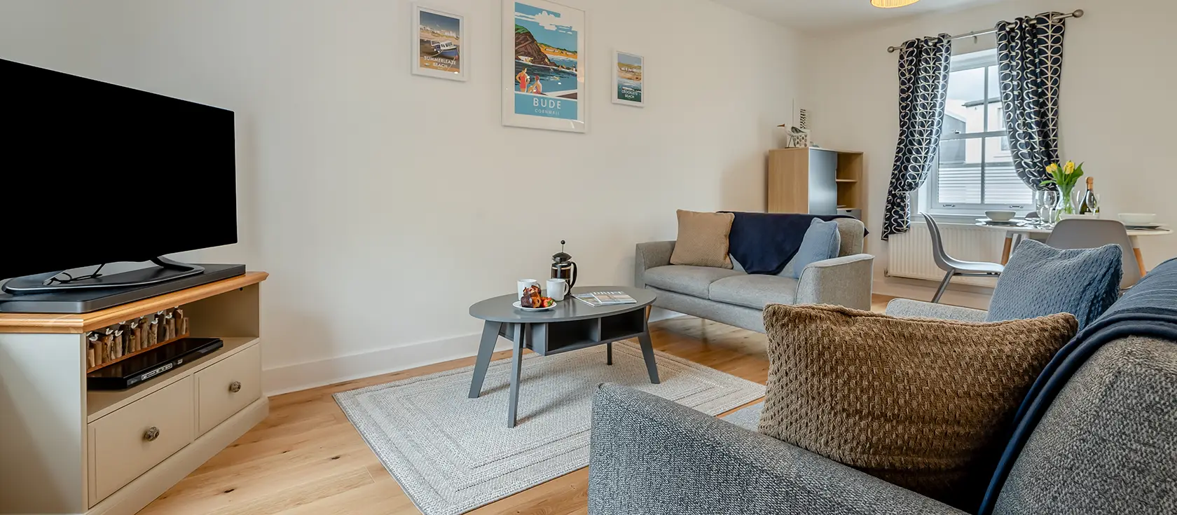 Upper Deck, Bude is a contemporary two-bedroom apartment offering a stylish seaside base for families and couples seeking a coastal escape with easy access to some of Cornwall's finest beaches. The fully equipped kitchen features an electric oven, ceramic hob, dishwasher, and microwave, perfectly appointed for holiday cooking and family meals. The bright, open-plan living space showcases calming whites, greys, and blues with elegant wooden flooring that creates a serene atmosphere. A circular dining table invites leisurely meals, whilst a comfortable sofa faces the Smart TV;ideal for cosy evenings after days spent exploring.
