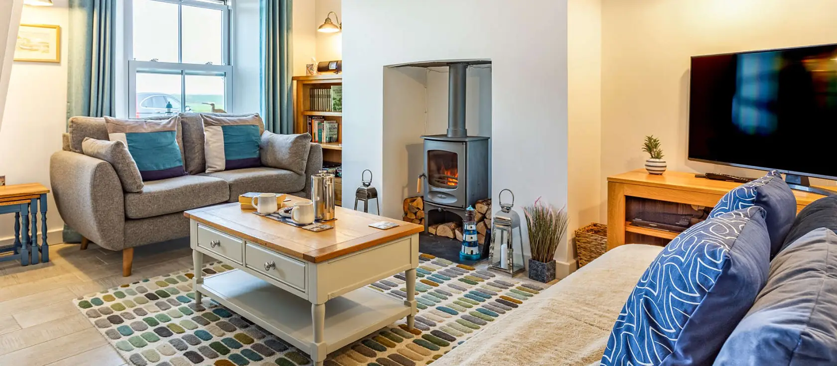 Christopher Cottage, Lanteglos, is a delightful two-bedroom retreat offering the perfect blend of traditional Cornish character and modern comfort. The fully equipped kitchen boasts an electric oven and hob, microwave, dishwasher, fridge / freezer, washer / dryer, and coffee machine, with a dining table perfectly positioned to capture inspiring countryside views through the kitchen window. The inviting lounge features exposed beams framing a cosy wood burner, plush seating arrangements, and a Smart TV with integrated Bluetooth speaker for entertainment.
