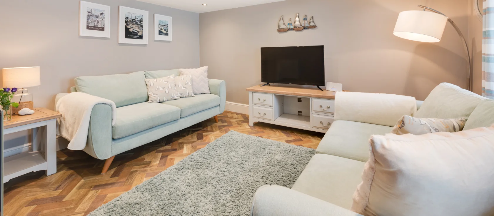 Atlantic Cottage, Porthleven is a charming three-bedroom retreat set just back from the seafront in one of Cornwall's most authentic fishing ports. The open-plan ground floor creates a welcoming atmosphere throughout, with beautiful herringbone flooring flowing across the space. Cleverly divided by the staircase, the living area offers two comfortable sofas, a Smart TV, and carefully chosen soft furnishings, while the well-equipped kitchen occupies the other side, featuring an electric oven and hob, fridge, microwave, and washing machine alongside a stylish wooden dining table with chairs for family meals.