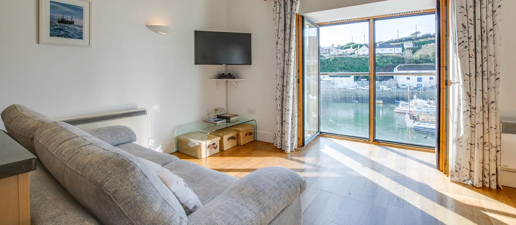 Quayside, Porthleven is a stunning contemporary apartment perched on the picturesque harborfront with enviable views across the water to the open sea. The well-equipped kitchen features granite worktops, electric oven, hob, dishwasher and all the essentials you need to prepare memorable meals. The bright, open-plan living area invites relaxation with comfortable leather sofas and a dining table, perfect for gathering with loved ones after exploring the charming coastal town.