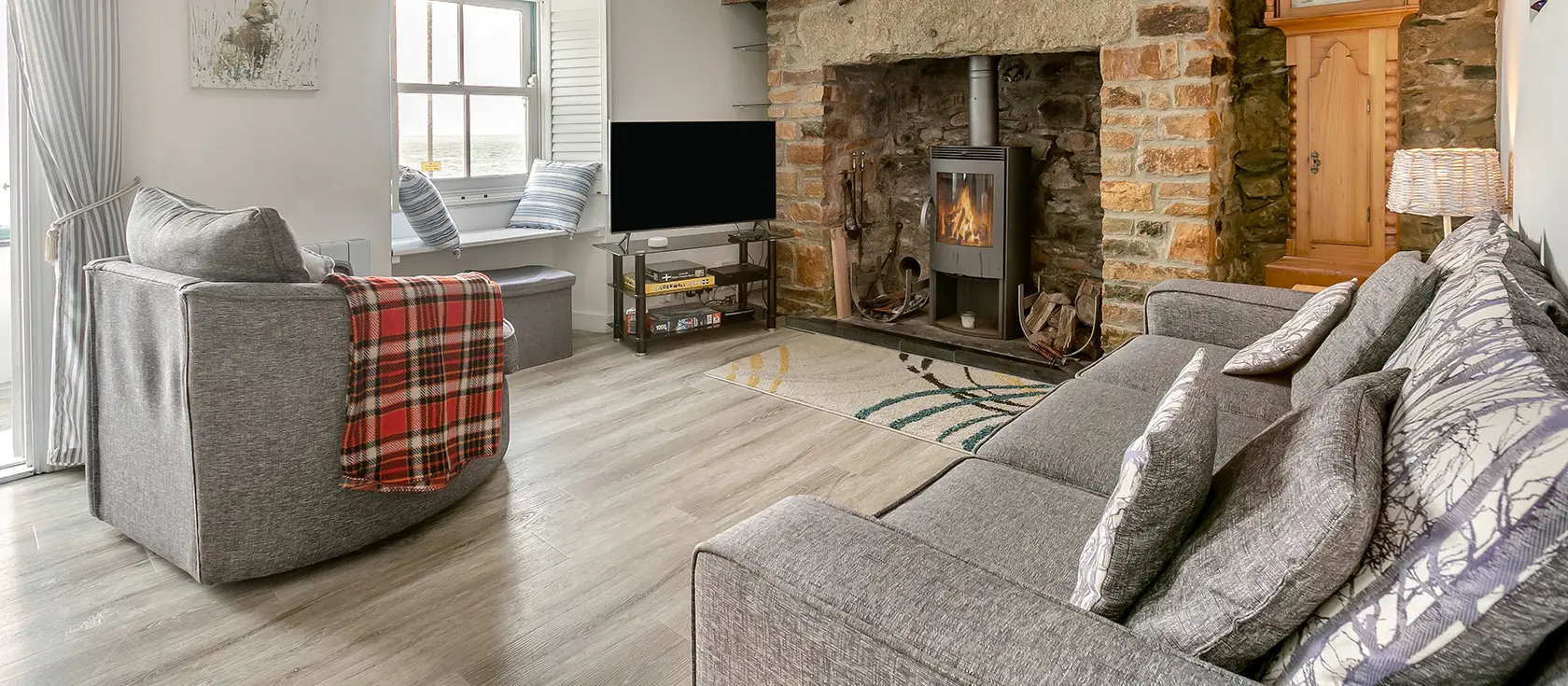 Samphire Cottage, Porthleven is a characterful two-storey coastal cottage brimming with personality and seven generations of family heritage. The spacious kitchen welcomes you with a breakfast bar and seating area, creating a sociable hub where conversations flow whilst preparing meals. Modern conveniences including a hob, oven, dishwasher, and fridge / freezer combine effortlessly with the room's warmth. The heart of the home reveals itself in an expansive open-plan living and dining room, where a substantial exposed stone chimney frames a welcoming wood burner. Comfortable sofas gather around a glowing fireplace with smart TV, with windows framing sea views. A wooden dining table with cushioned bench seating beside a window seat invites leisurely meals. Beyond lies a sunroom offering panoramic views, perfect for morning coffee or evening reflection.