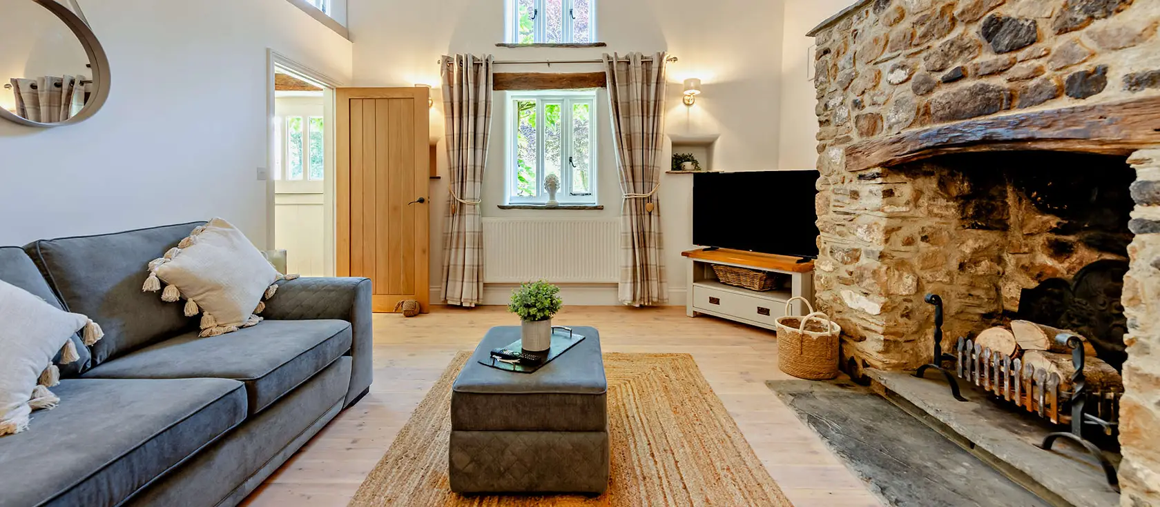 Kelly Mill Cottage, Lifton, is a beautifully renovated two-bedroom retreat set within 12 acres of private meadows and woodland, with a mill stream running beside the property. The open-plan kitchen / diner features stylish modern appliances including an electric oven with induction hob, dishwasher, wine cooler, and coffee machine, with a generous dining table perfectly positioned for relaxed family meals. The spectacular double-height lounge area showcases exposed oak beams and original stone walls, complete with comfortable seating, a Smart TV, and a roaring open fire for cosy evenings.