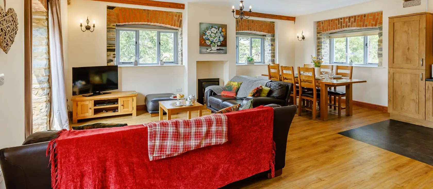 Otter Barn Lakes, St Giles-on-the-Heath is a delightful barn conversion on the Devon and Cornwall border. The modern kitchen is fully equipped with an electric oven and hob, microwave, dishwasher, and washer / dryer. Step through the double patio doors into the spacious open-plan lounge/kitchen/diner, where floor-to-ceiling windows frame stunning views across the rolling countryside and shimmering lakes. Two inviting sofas and a television create the perfect gathering spot for cosy family film nights, whilst the dining area seats all guests comfortably for shared meals.