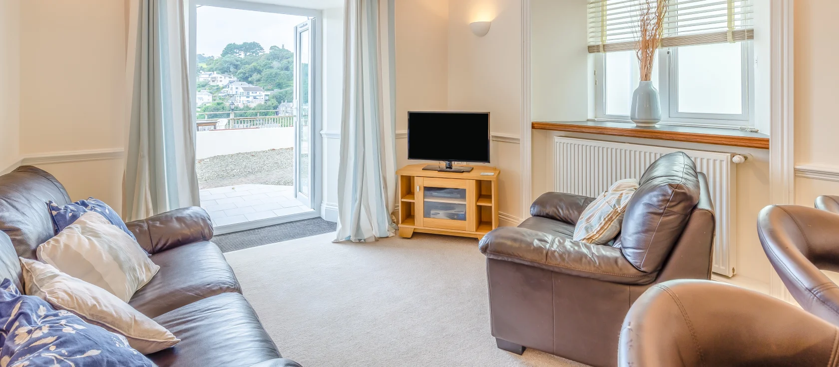 Manor House, Looe is a light-filled apartment perfectly positioned to enjoy this enchanting Cornish fishing town, just 300 metres from the golden sands of Looe's main beach. The open-plan lounge, kitchen and dining area welcomes you with French doors flooding the space with natural light, leading onto a private patio overlooking the shimmering river. A comfortable sofa sits before the Smart TV, while the breakfast bar provides an inviting spot for leisurely morning coffee. The modern kitchen features an electric oven and hob, microwave, dishwasher, and fridge / freezer, making it easy to prepare everything from picnic lunches to evening suppers.