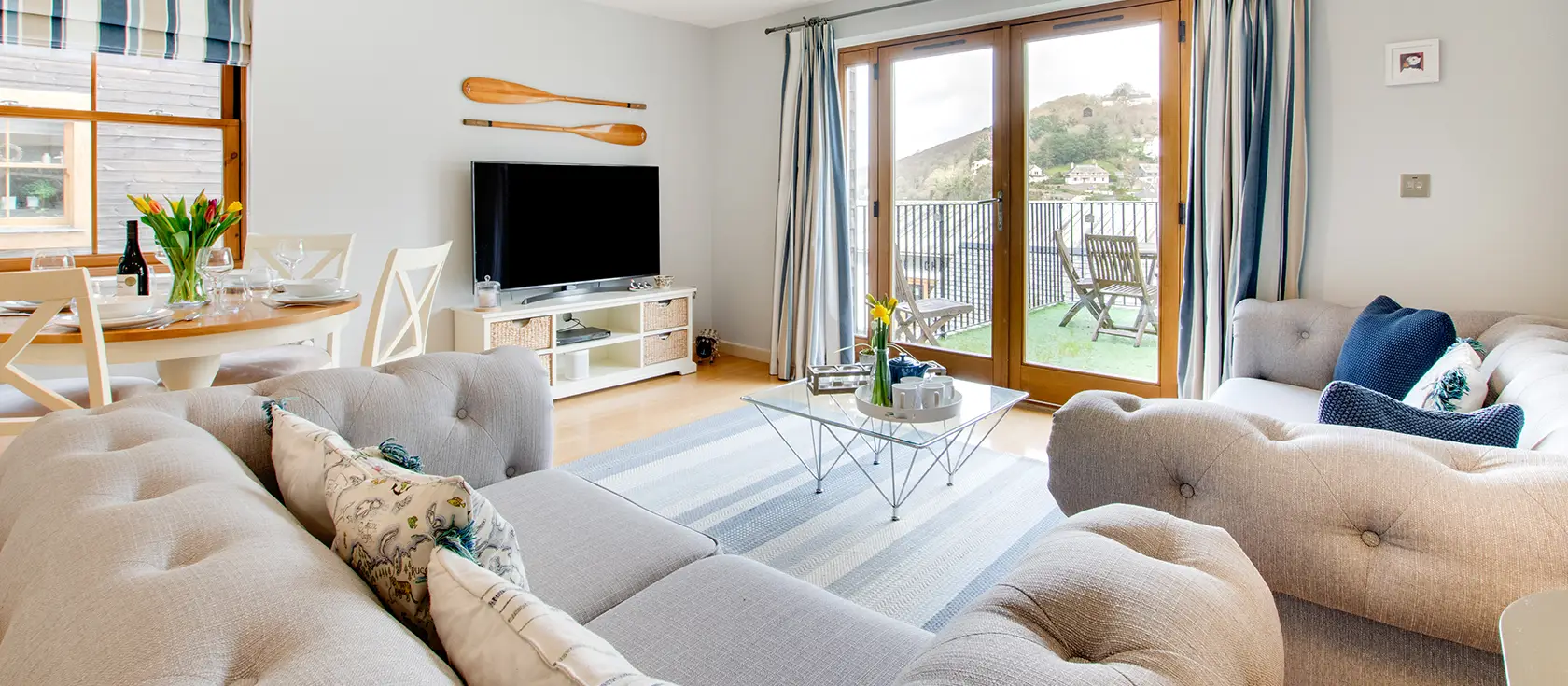 Number Six, The Creekside, Looe is a contemporary first-floor apartment perfectly designed for couples and small families seeking a relaxing Cornish getaway. The open-plan kitchen features a modern electric hob, oven, and breakfast bar positioned at the kitchen island with two stools, seamlessly flowing into the sophisticated living and dining area. Wooden accents and light-toned coastal-inspired decor create an inviting atmosphere where you can settle onto comfortable sofas and gaze across the balcony towards the river beyond.
