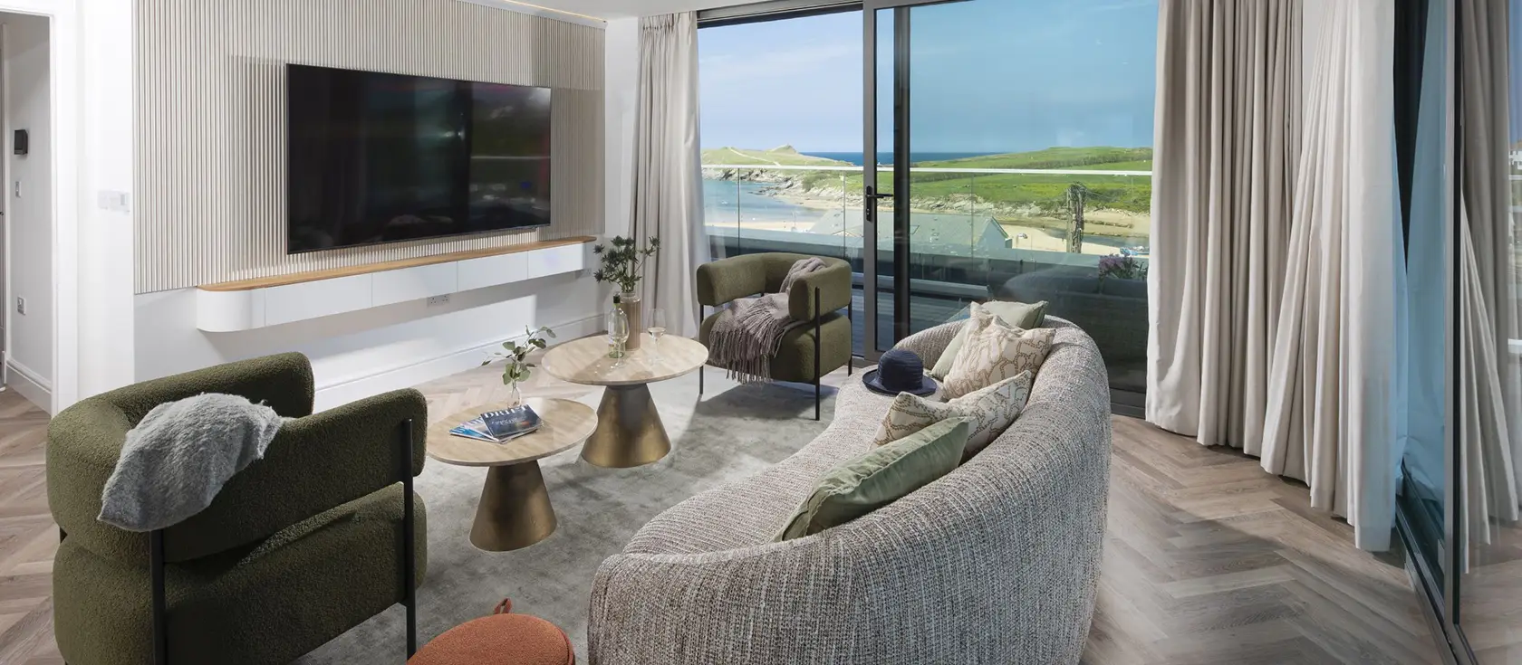 The Penthouse, Oasis Sands, Newquay is a luxurious top-floor apartment just steps from Porth Beach. Enjoy dual-aspect sea views, three bedrooms, and a wraparound balcony perfect for families seeking coastal elegance and beachside memories.