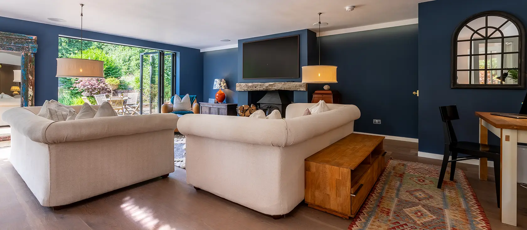 To the left, an impressive lounge features Smart TV, Sonos sound system and magnificent bi-folding doors framing countryside views. An undercover shed houses a tennis net, football goals and table tennis table for active fun. Outside, an enchanting wrap-around garden boasts tiered landscaping, two BBQ areas, fire pit, children's swing, and a wood-fired hot tub with creek views. Upstairs, five bedrooms, two king-size, one double, one double with single, one twin, ensure comfort for all guests, with three bathrooms and a ground-floor WC completing this family haven.