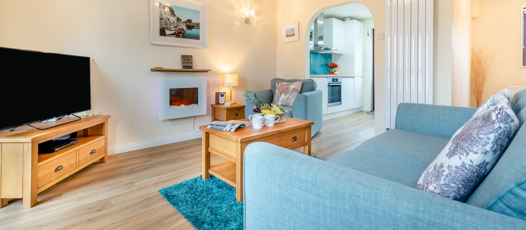 The Nutshell, Padstow is a captivating contemporary cottage perfectly positioned just half a kilometre from the renowned Camel Trail and within easy strolling distance of Padstow's bustling harbour. The open-plan lounge, kitchen and dining area welcomes you with quintessentially coastal hues echoing the colours of the local shoreline, creating a wonderfully soothing space for gathering after days exploring the coast. The very well equipped kitchen features an electric oven, induction hob, integrated fridge and freezer, microwave, Nespresso coffee machine, dishwasher and washing machine, whilst the dining table provides a sociable spot for sharing meals together.