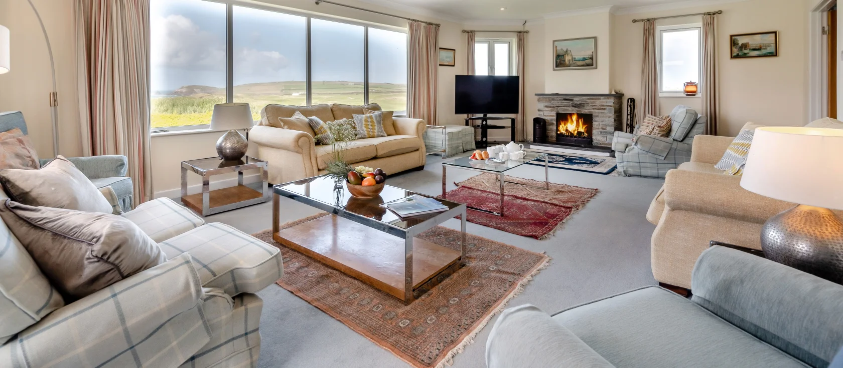 Trefebus, Constantine Bay is a spectacular six-bedroom family house positioned immediately beside the championship Trevose Golf Course, where golden sands lie just 400 metres from your door. The well-equipped open-plan kitchen features a central island, double electric oven, ceramic hob, dishwasher, two refrigerators, and modern appliances including coffee machine and air fryer. The expansive first-floor lounge welcomes you with four sofas, two armchairs, a Smart TV with Sky, and an open fireplace with stone surround, whilst panoramic windows frame magnificent views across the golf course to Trevose Head and the sparkling Atlantic beyond. The dining room seats twelve guests around a generous table, sharing those same captivating elevated views.