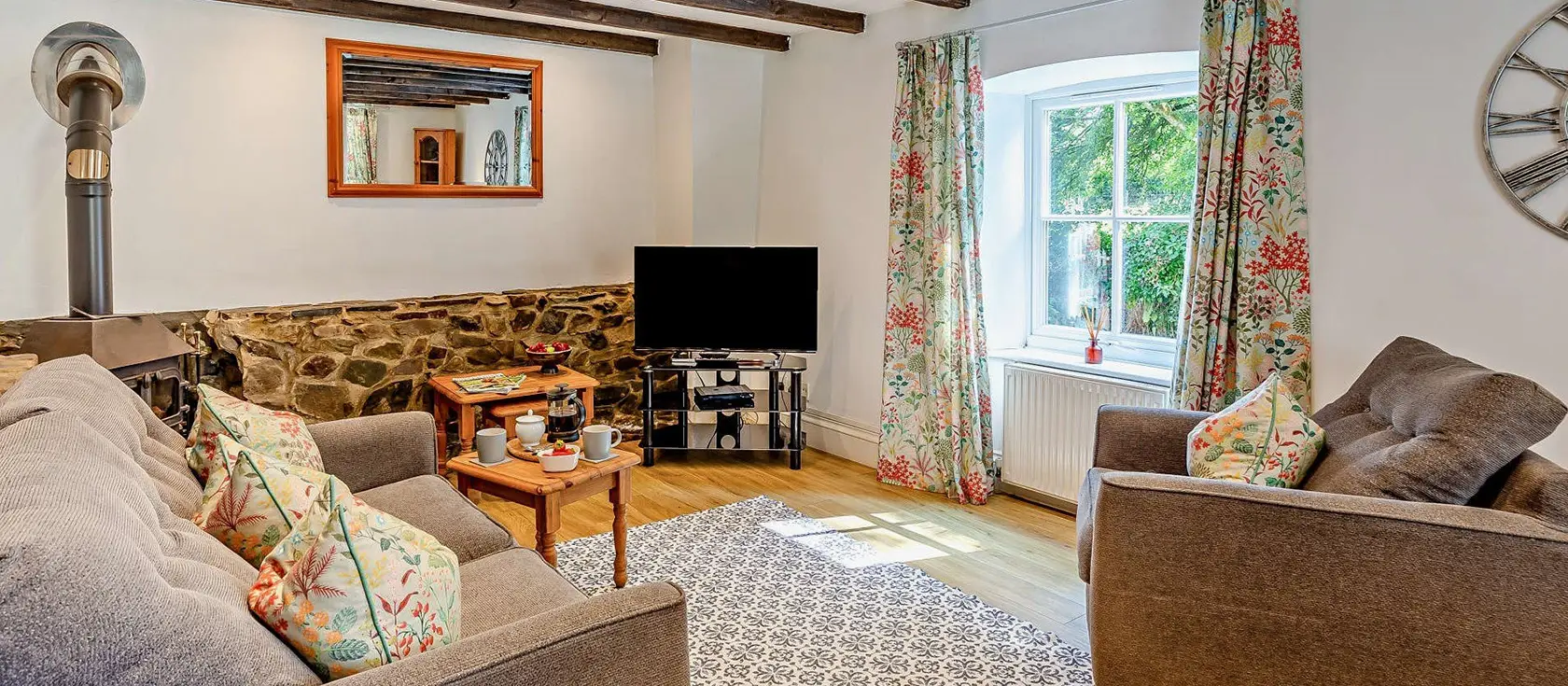Annas Cottage, Langtree is a characterful one-bedroom retreat nestled in a picturesque wooded valley, offering an idyllic hideaway for couples and enthusiastic walkers. The well-equipped kitchen features an electric oven and hob, dishwasher, fridge with ice compartment, microwave, and washer / dryer – everything needed to rustle up tasty meals. The spacious lounge/diner showcases charming exposed stonework and a welcoming woodburner, with the first basket of logs provided to create a wonderfully cosy atmosphere. Sky TV, DVD, and a hi-fi system ensure you can unwind with your favourite entertainment.