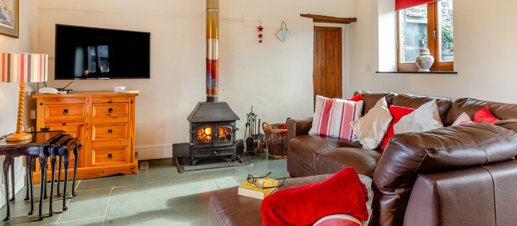 Oriel Cottage, Muddiford is a beautifully restored single-storey barn conversion set in rolling North Devon countryside, perfectly positioned for exploring both Exmoor National Park and the dramatic coastline beyond. The spacious living area welcomes you with a large L-shaped sofa and armchair arranged around a crackling wood burner beneath vaulted ceilings, whilst exposed stonework and structural timbers showcase the building's heritage. Patio doors flood the room with natural light and open onto the private garden, where a bubbling hot tub awaits beneath the stars.
