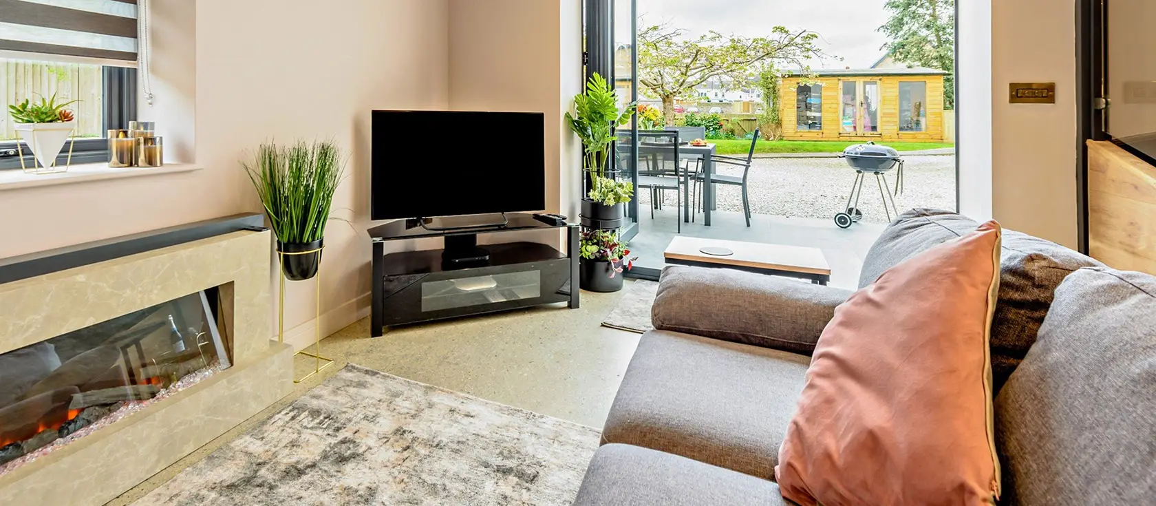 Beyond the patio sits a grassy garden area perfect for games and relaxation, with additional seating and a charcoal BBQ ideal for al fresco dining and evening entertaining. Upstairs, you'll find two beautifully appointed bedrooms, a king-size and a double, each boasting its own en-suite shower room with WC. An additional ground-floor WC serves guests conveniently, whilst Smart TVs in both bedrooms and the lounge ensure entertainment options. Underfloor heating downstairs wraps the entire property in warmth and cosiness throughout your stay.