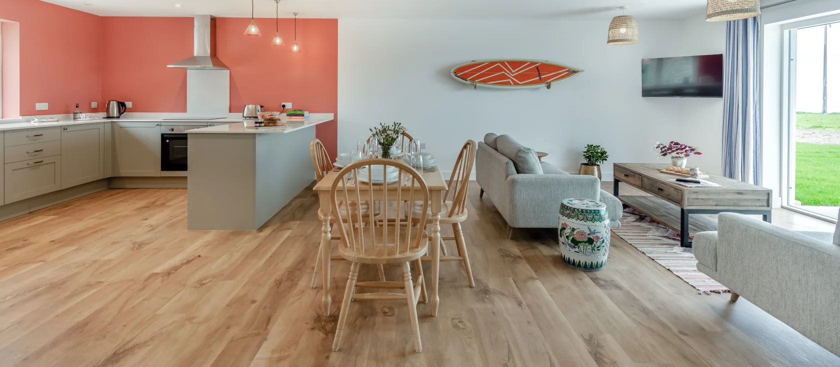 Three Corners Barn, Abbotsham is a stylish semi-detached conversion perfectly suited for couples, friends, or small families seeking a peaceful coastal escape. The open-plan living space combines kitchen, dining, and lounge areas with thoughtful design throughout. The well-equipped kitchen features an electric oven and hob, microwave, dishwasher, fridge / freezer, and washing machine, whilst the dining area comfortably seats four. The inviting lounge offers cosy seating arranged around a Smart TV, creating the perfect spot for relaxed evenings after days exploring the North Devon coast.