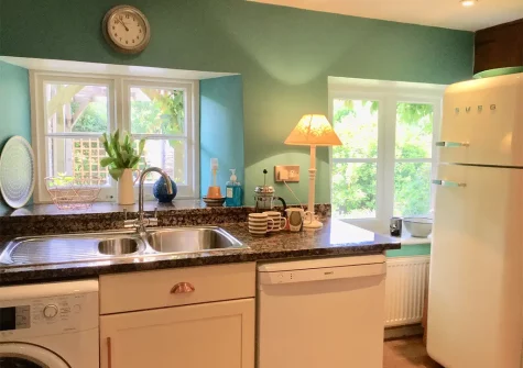 Valleys End, Weare Giffard, is a quintessential thatched cottage nestled in a traditional Devon village. Step into the welcoming entrance hallway, where a charming piano sets the tone for a truly atmospheric stay. The well-equipped kitchen boasts granite worktops, a gas oven and hob, and an array of modern appliances, including a dishwasher and microwave. For those seeking a touch of nostalgia, an oil-fired Rayburn adds character and warmth to the space. Unwind in the cosy lounge, where exposed beams and a large stone fireplace with a crackling wood burner create a haven of relaxation. Entertainment is at your fingertips with a TV / DVD, Hi-Fi, and Bluetooth soundbar.