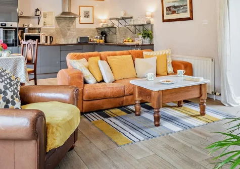 Converted from a former coach house stable, Stable Cottage is a lovely one-bedroom cottage in the small town of Colyton. The cottage has a reverse-level for plan, with the large double bedroom on the ground floor. Also on the ground floor there is the bathroom, with a large tub that is perfect for a relaxing soak. On the first floor there’s the large open-plan living area, with a kitchen and dining area. The kitchen is fully equipped, and the dishwasher means there is no washing up after a romantic dinner. After dinner, relax on the sofas in the inviting living area.