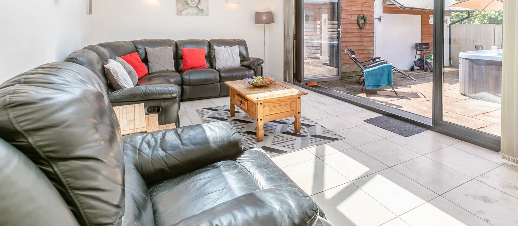 Step outside, where the enclosed patio features garden furniture, charcoal barbecue, and private hot tub, beyond which stretches a large lawned garden. A shared dog walking paddock adjoins the property, perfect for exercising your four-legged friends. Two ground-floor bedrooms ensure accessibility: one king-size room with en-suite shower room, and one flexible twin zip-and-link (convertible to super-king-size on request). A family bathroom with shower over bath completes the layout.