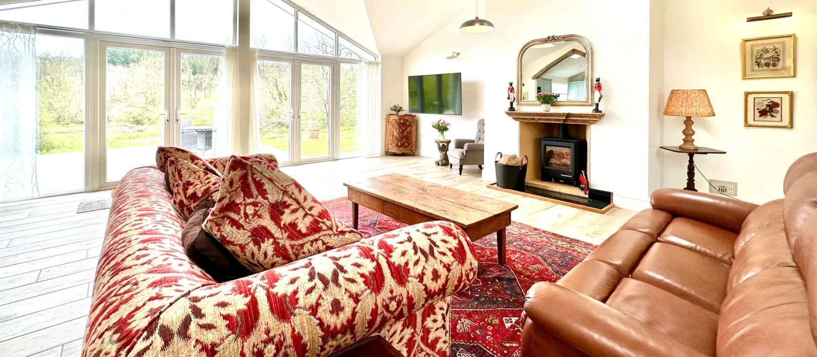 Bourne Lodge, Witheridge is a charming woodland retreat nestled within 20 acres of private grounds near the delightful village of Witheridge. The spacious open-plan living area welcomes you with floor-to-ceiling windows framing views across the woodland and fishing lake, whilst original exposed beams and contemporary underfloor heating create a perfect blend of traditional character and modern comfort. Two comfortable sofas and an armchair gather around the warming wood burner, inviting cosy evenings with films on the Smart TV. The well-appointed kitchen provides everything needed for stress-free stays, whilst the dining table seats all guests comfortably for memorable meals together.
