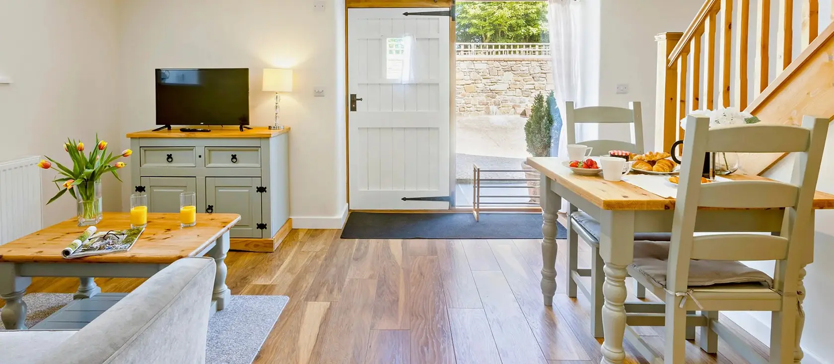 The Wren, Higher Clovelly, is a beautifully restored barn conversion offering an intimate and romantic retreat for couples in the heart of the North Devon countryside. The well-appointed kitchen, complete with an electric oven, gas hob, microwave, and fridge, makes self-catering an effortless pleasure. Step through into the open-plan lounge and dining room, where soft, country-inspired tones, warm natural light, and rustic charm create a wonderfully calming atmosphere.