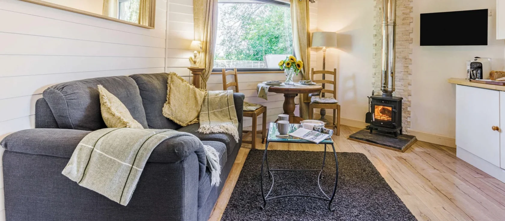 Becks Meadow Lodge, Black Torrington, is a beautifully presented one-bedroom lodge nestled in the heart of the Devon countryside, offering a blissful romantic retreat for couples. Step through the stable doors into a bright, airy open-plan kitchen, lounge, and dining room, where beautiful exposed beams add real character. The well-equipped kitchen features an electric oven and hob, microwave, dishwasher, and a Lavazza coffee machine for leisurely mornings. Relax in the lounge beside the cosy wood burner, perfect for unwinding on cool evenings.