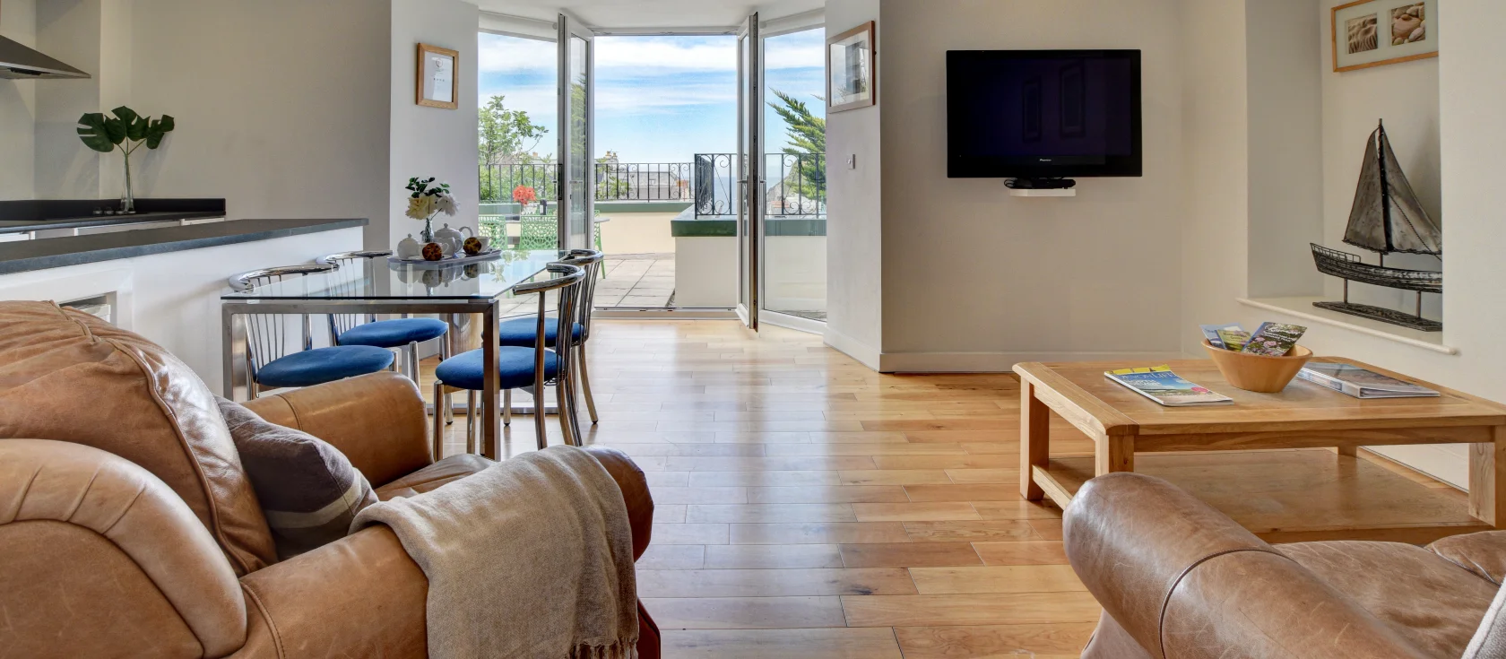Belle View, Ilfracombe is a charming first-floor apartment perfectly positioned just off the high street, offering a peaceful retreat within easy reach of this historic harbour town's amenities. The open-plan living area features a pair of comfortable sofas and French doors that flood the space with natural light whilst framing lovely harbour views. The neat kitchen area includes an electric oven and hob, microwave, and fridge, with a separate utility cupboard housing the washing machine and freezer. A dining table sits ready for relaxed meals overlooking the terrace beyond.