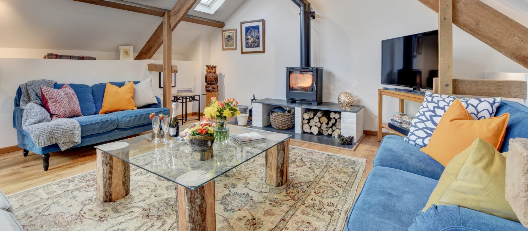 Outside, the generous patio provides garden furniture, dining table and chairs, and a barbecue, while sun loungers invite lazy afternoons with a good book. Access to the pretty meadow and dedicated dog walking field gives four-legged friends plenty of space to explore, and undercover storage keeps bikes and surfboards safe. Climb the striking oak and metal staircase to discover the magnificent first-floor living space, where vaulted ceilings, exposed oak beams, and large skylights create a wonderfully light and airy atmosphere. The open-plan kitchen features an induction hob, integrated appliances including dishwasher, and a dining area where everyone can gather for holiday meals together. The comfortable sitting area centres around a cosy wood burner, perfect for warming up after coastal walks, with a Smart TV and Bluetooth soundbar for entertainment.