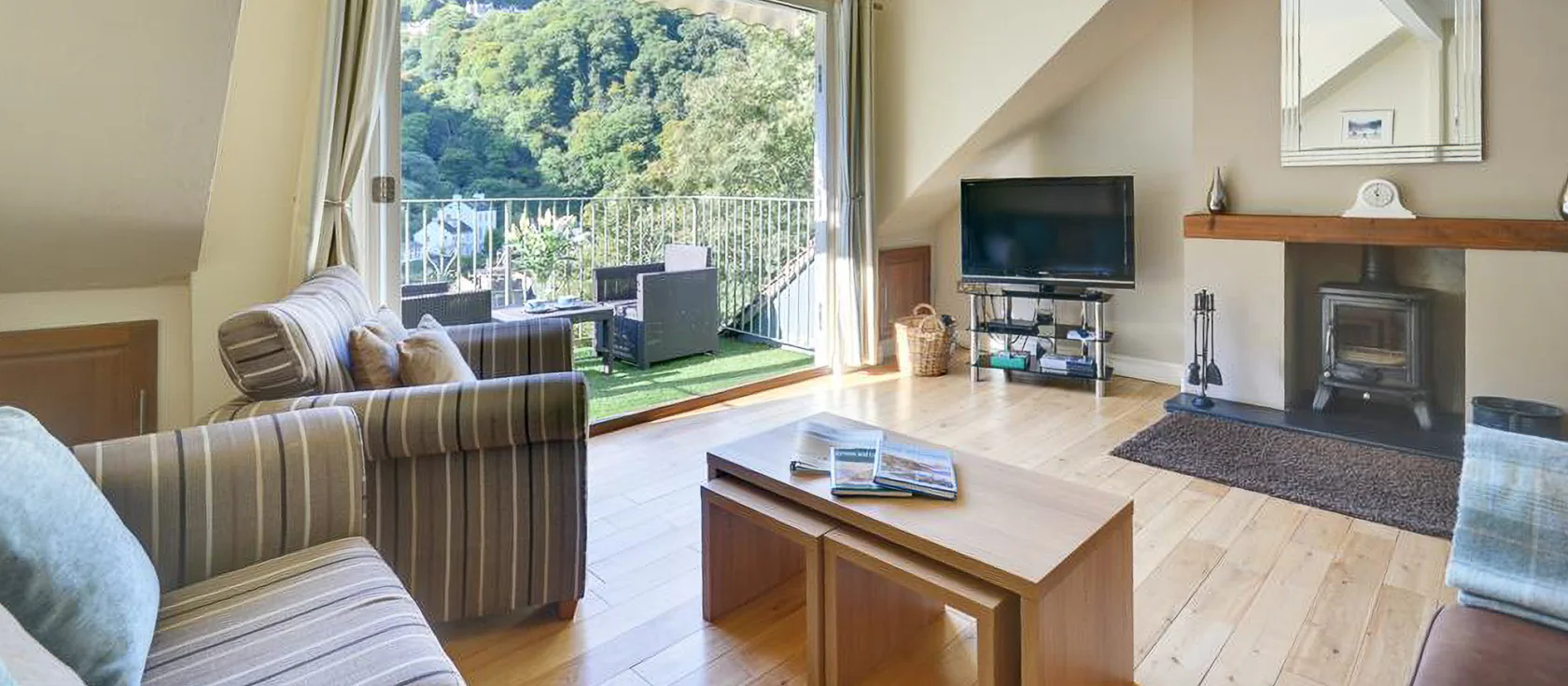 Aberlyn, Lynmouth, is a beautifully appointed top-floor apartment offering a tranquil retreat for couples or small families. The well-equipped kitchen features an electric oven and hob, microwave, fridge, freezer, dishwasher, pod coffee machine, and a wine cooler, providing everything you need for a comfortable stay. The light-filled, open-plan lounge / kitchen / dining space is bathed in natural light from glazed bi-fold doors leading to the private balcony. Sink into comfortable seating beside the wood burner, or gather around the dining table to share the highlights of the day.