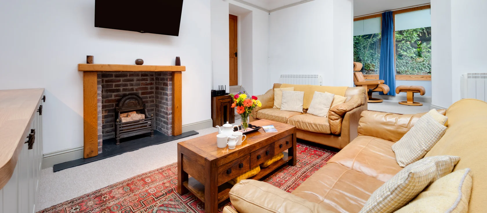 The Orangery, Lynton Cottage welcomes you into a light-filled open-plan living, dining and kitchen area, where a high apex ceiling and large Victorian skylight create a wonderfully airy atmosphere. The well-equipped kitchen features a range-style cooker, integrated dishwasher, and fridge / freezer, while the adjacent dining table seats your party comfortably. Leather furnishings in the main living space evoke period grandeur, complemented by a wall-mounted Smart TV and DAB radio. A cosy side room offers a quiet retreat, whilst steps lead down to an additional lounge with flexible day bed sleeping and space to relax or work.
