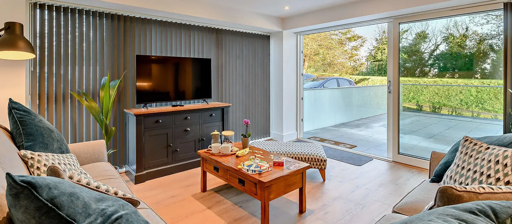 Skippers Corner, Plymouth is an elegantly styled ground-floor apartment offering a sophisticated urban retreat in the heart of the city. The fully equipped kitchen features an electric oven, hob, and microwave, alongside a premium L'Or POD coffee machine for that perfect morning brew. The open-plan living space seamlessly connects the dining area and a cosy lounge with two generous sofas, one cleverly converting into a sofa bed for flexible sleeping arrangements. Board games, books, and a Smart TV ensure entertainment for all ages, whilst floor-to-ceiling sliding doors flood the room with natural light.