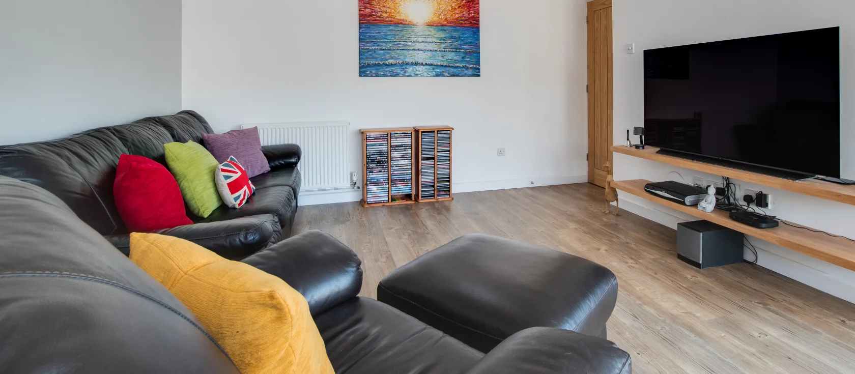5 The Fairway, Braunton is a thoughtfully designed two-bedroom bungalow nestled in a peaceful residential area, just over a kilometre from Braunton's vibrant shops, cafes and restaurants. The bright kitchen features jewel-like mauve and pink accents alongside pale wood, equipped with an electric double oven, gas hob, Tassimo coffee machine, air fryer, dishwasher and washing machine. Two fridges and two freezers provide ample storage for family provisions. The spacious lounge and dining room overlooks the garden through large windows, welcoming natural light alongside pops of blue, yellow and red throughout the comfortable seating area, complemented by a Sky and Smart TV.