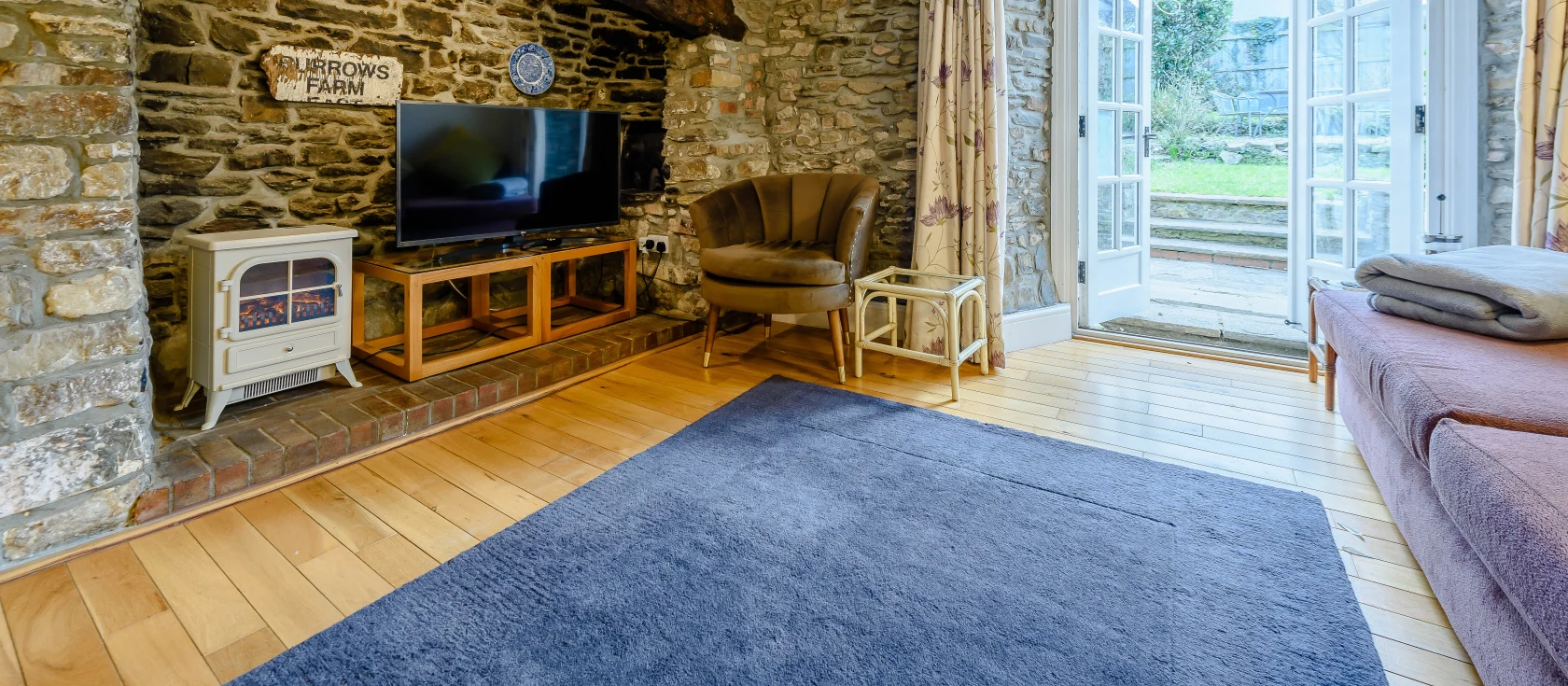 Burrows Farmhouse, Croyde is a delightful Grade II listed thatched cottage tucked into this charming coastal village on North Devon's celebrated Golden Coast. The well-equipped country-style kitchen and dining room flow together in open-plan fashion, featuring an electric cooker and hob, dishwasher, fridge and small counter-top freezer, and microwave, with a large table bringing everyone together for leisurely meals. The comfortable living room welcomes you with oak floors, an original inglenook fireplace now home to a Smart TV, and patio doors opening onto the rambling cottage garden.