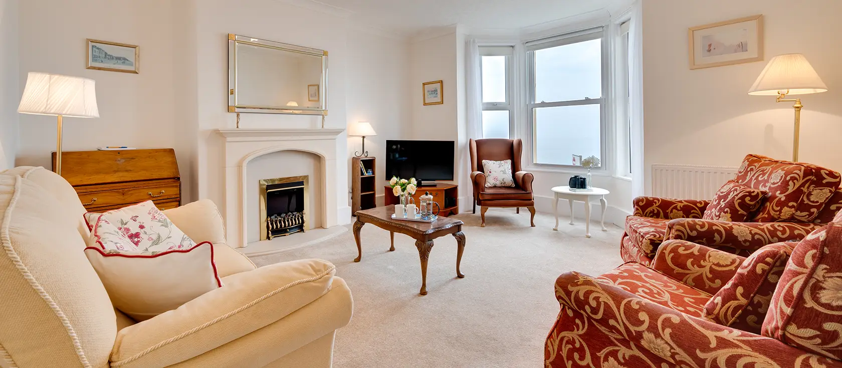 The apartment features two generously proportioned bedrooms—a king-size and a twin—each providing peaceful retreats after days exploring the coast. A well-appointed family bathroom with shower over bath and heated towel rail serves both bedrooms, ensuring comfort for all guests. With its antique-style furnishings, period features, and meticulous mid-century aesthetic, this first-floor sanctuary combines timeless elegance with modern convenience.