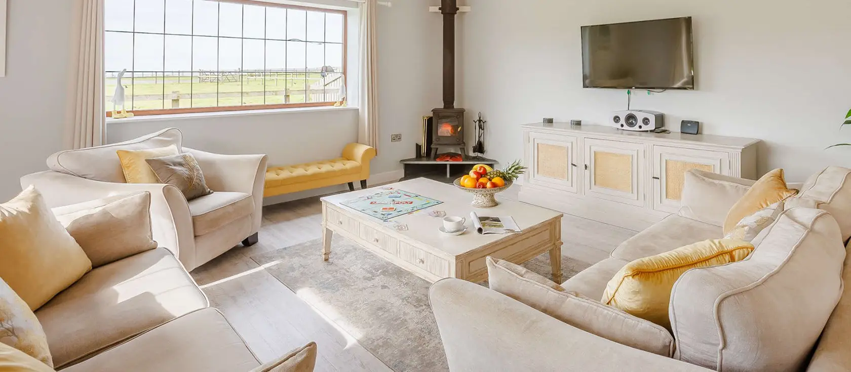 • The dual-aspect living space with vaulted ceiling and corner wood burner creates a wonderfully atmospheric gathering place, where families can relax together whilst enjoying stunning coastal vistas.