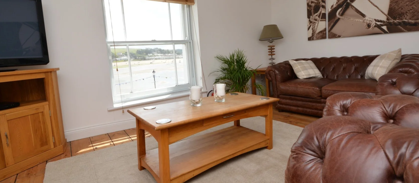 Outside, step from the kitchen onto the shared patio area, complete with seating and barbecue facilities. Parking is available roadside nearby (subject to availability) or in the nearby car park where weekly tickets can be purchased. Climb to the second floor and discover the light-filled lounge, where panoramic views across the estuary and quayside create a captivating backdrop for relaxation. Comfortable leather sofas invite you to unwind before the TV / DVD, while a handy refreshment area allows for easy tea and coffee making.