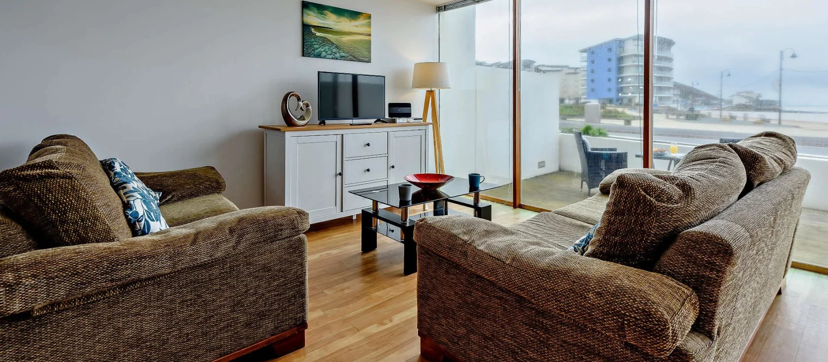 Nautilus Sea View is a stylish, contemporary ground-floor apartment set in an unrivalled seafront position in Westward Ho!, with spectacular views stretching across the bay. The well-appointed kitchen is equipped with an electric oven and hob, fridge, freezer, and microwave – all you need for an effortless self-catering stay. In the bright, airy open-plan living area, floor-to-ceiling windows frame the glittering coastline in all its glory, while a Smart TV, DVD player, and DAB radio ensure relaxed evenings are well catered for. Step out onto the front patio, where comfortable garden furniture sets the perfect scene for sunset drinks as the sky blazes gold above the sea.