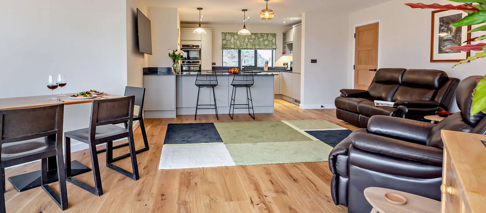Lyndhurst, Woolacombe, is a stylish one-bedroom open-plan apartment offering a charming and romantic coastal retreat for couples and their four-legged friends. The beautifully equipped kitchen features an electric oven and hob, a Quooker hot tap, fridge / freezer, dishwasher, microwave, and coffee machine, with a handy breakfast bar perfectly suited to leisurely starts to the day. In the generous open-plan lounge and dining area, sink into the leather sofa and enjoy a favourite film on the Smart TV. On sunnier days, swing open the bi-fold doors to let the fresh sea air and coastal light come flooding in.