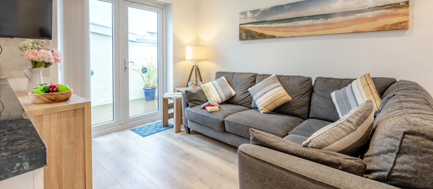 Step outside onto the enclosed decked patio, a peaceful suntrap with garden furniture and pretty potted plants, perfect for al fresco dining and evening relaxation. Upstairs, the king-size bedroom and twin room (with its own Smart TV) are tastefully decorated in nautical themes with plenty of natural light. A contemporary fully-tiled bathroom with shower over bath completes the first-floor layout. The lockable cupboard in the front porch provides handy storage for surfboards and beach equipment, while roadside parking close by includes a free permit for the summer season.