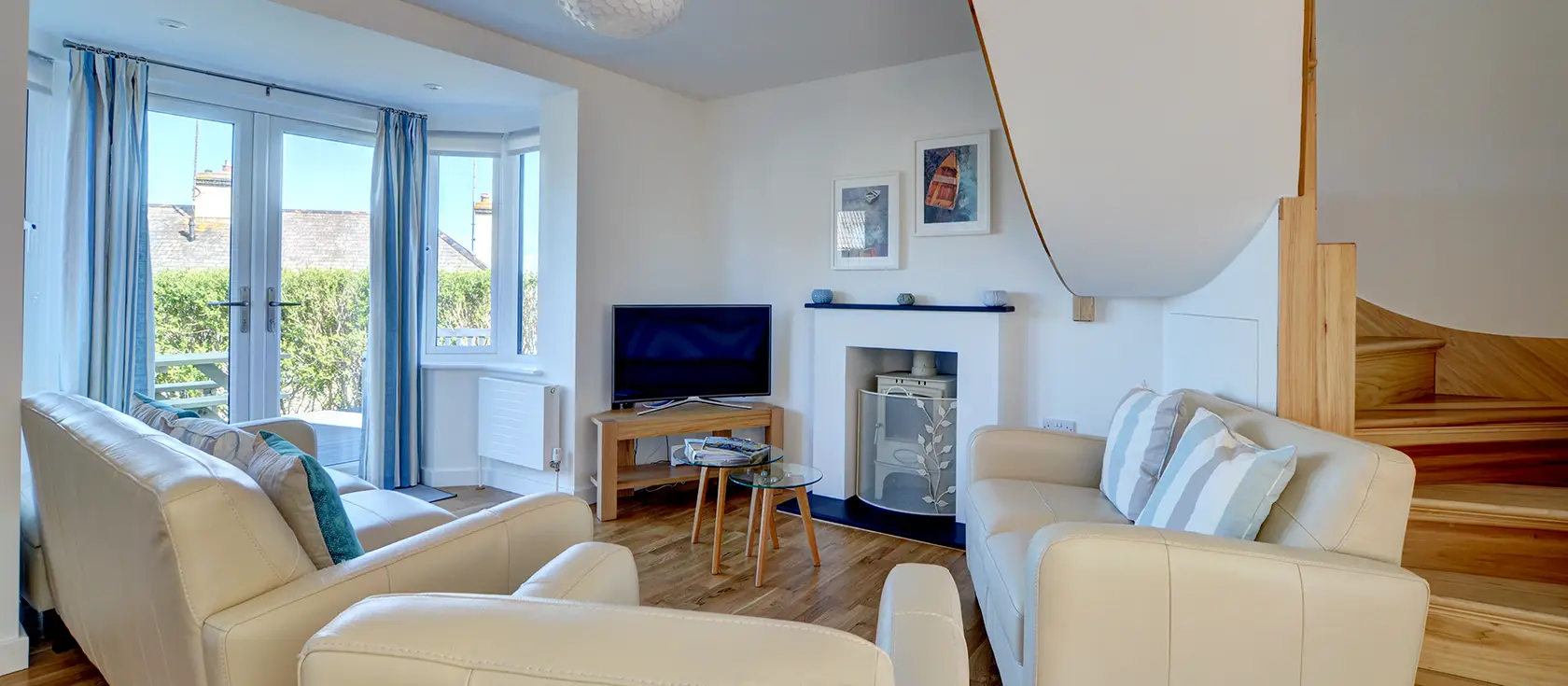Spindrift, Mortehoe, is a beautifully renovated contemporary home offering a light-filled retreat for up to six guests across three stylish bedrooms. The modern kitchen features an electric hob, twin ovens, microwave, and dishwasher, perfectly equipped for preparing family meals. The open-plan lounge / kitchen / diner provides a wonderful space for gathering together, with comfortable sofas arranged around a cosy wood burner, ample dining seating for everyone, and French doors flooding the room with natural light.